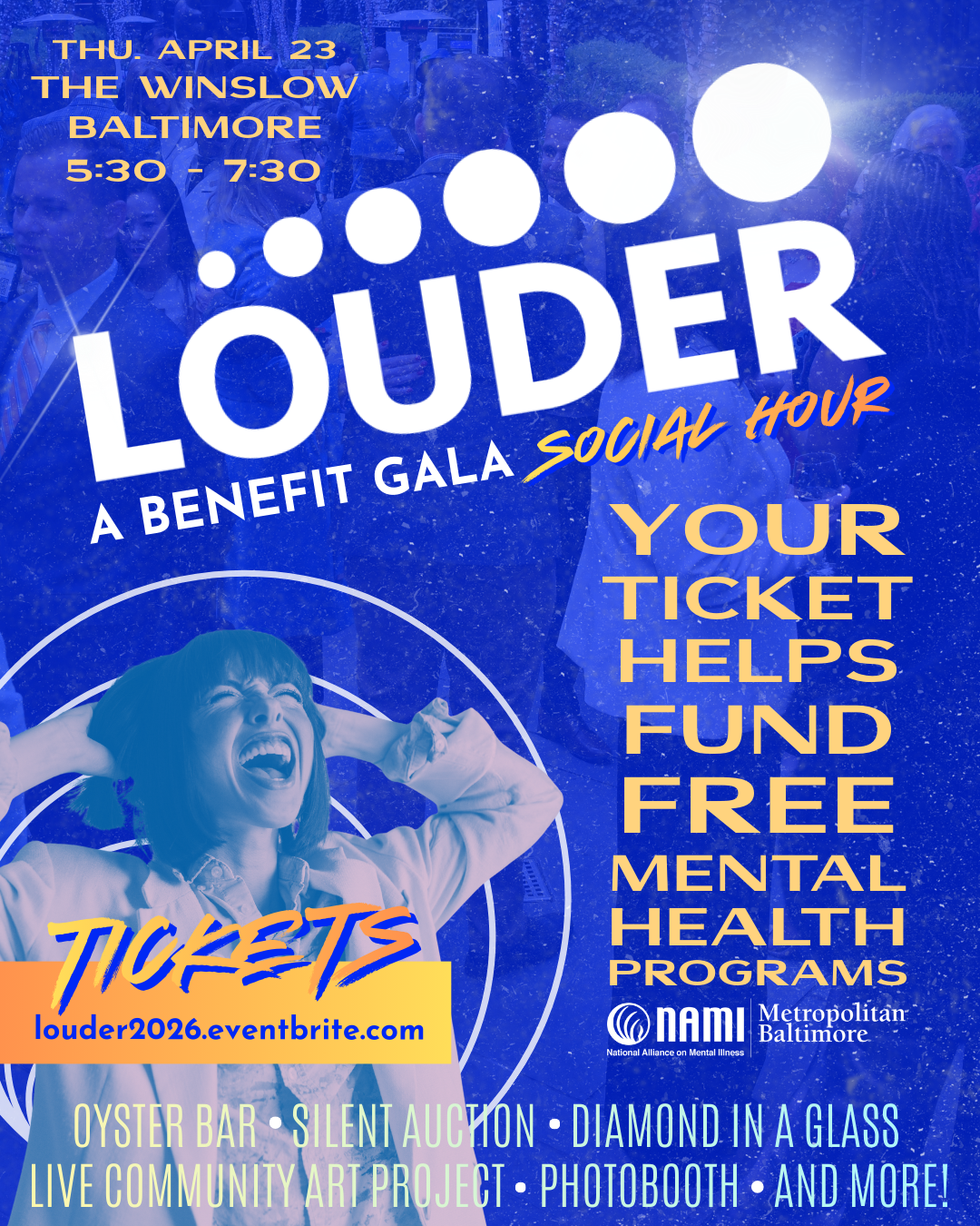 Funds raised from the LOUDER event will fuel NAMI Metropolitan Baltimore’s ongoing efforts to enhance the lives of local individuals, families, and communities affected by mental health conditions. Donations will enable the organization to continue to expand vital free support groups, educational programs, and mental health services offered at no cost to the Baltimore community.